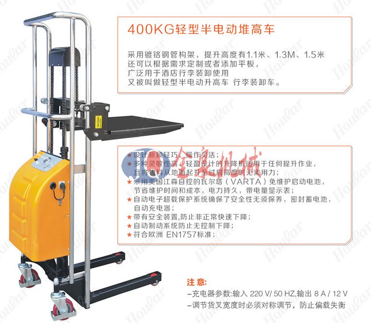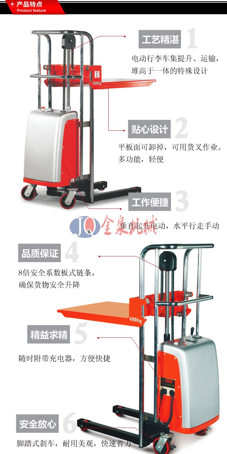 金泉輕型半電動(dòng)堆高車(chē)采用:1.高品質(zhì)電動(dòng)泵站,操作輕巧省力 2. 免維護(hù)電池,電池持久,3.帶電量顯示 4.車(chē)架多層鍍鉻工藝,美觀耐用 5. 內(nèi)置式充電口,充電方便安全