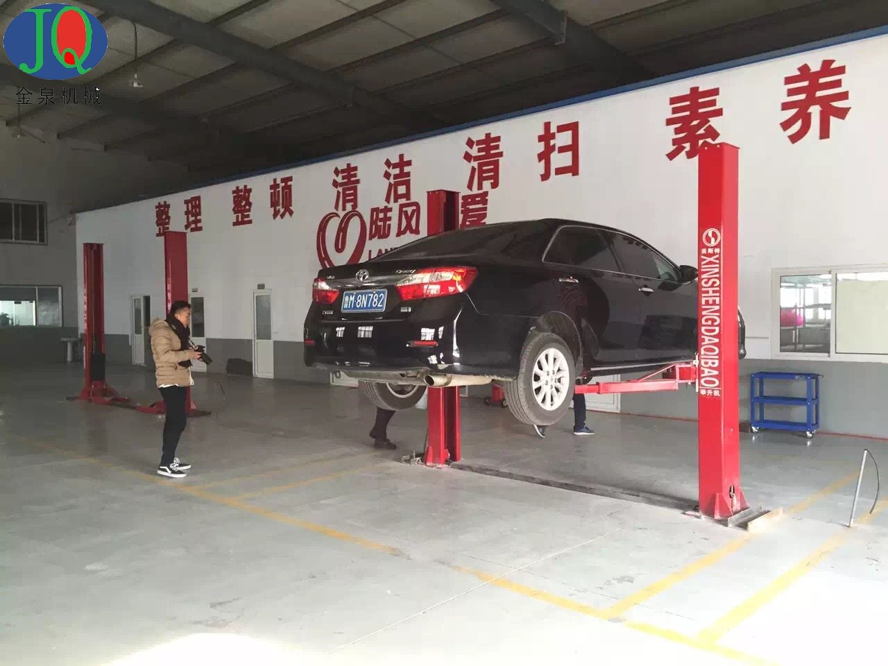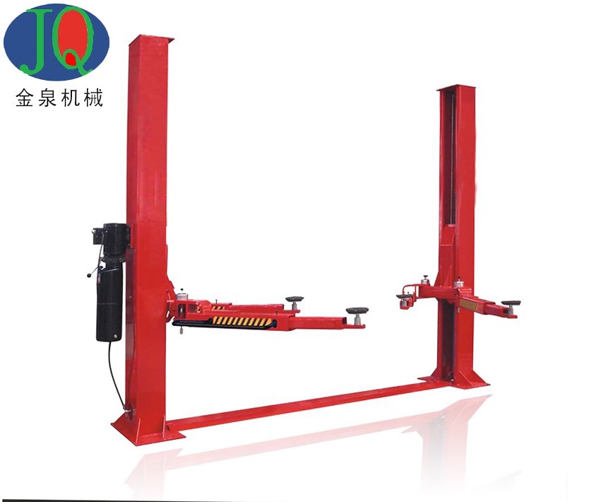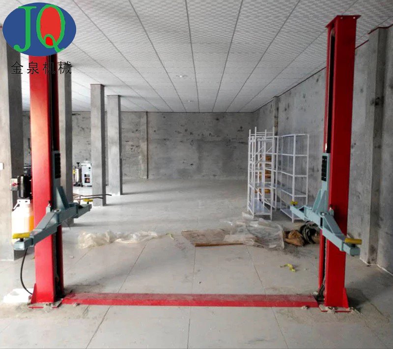 雙柱式汽車舉升機是一種汽車修理和保養(yǎng)單位常用的專用機械舉升設(shè)備,廣泛應(yīng)用于轎車等小型車的維修和保養(yǎng)。雙柱式汽車舉升機將汽車舉升在空中的同時可以節(jié)省大量的地面空間,方便地面作業(yè)。但是雙柱式汽車舉升機為了最大的節(jié)省材料,一般都去掉了底板。由于沒有底板,使得立柱的扭力需要靠地面來抵消,所以對地基要求很高,若是有橫梁(龍門舉升機)就靠橫梁抵消。