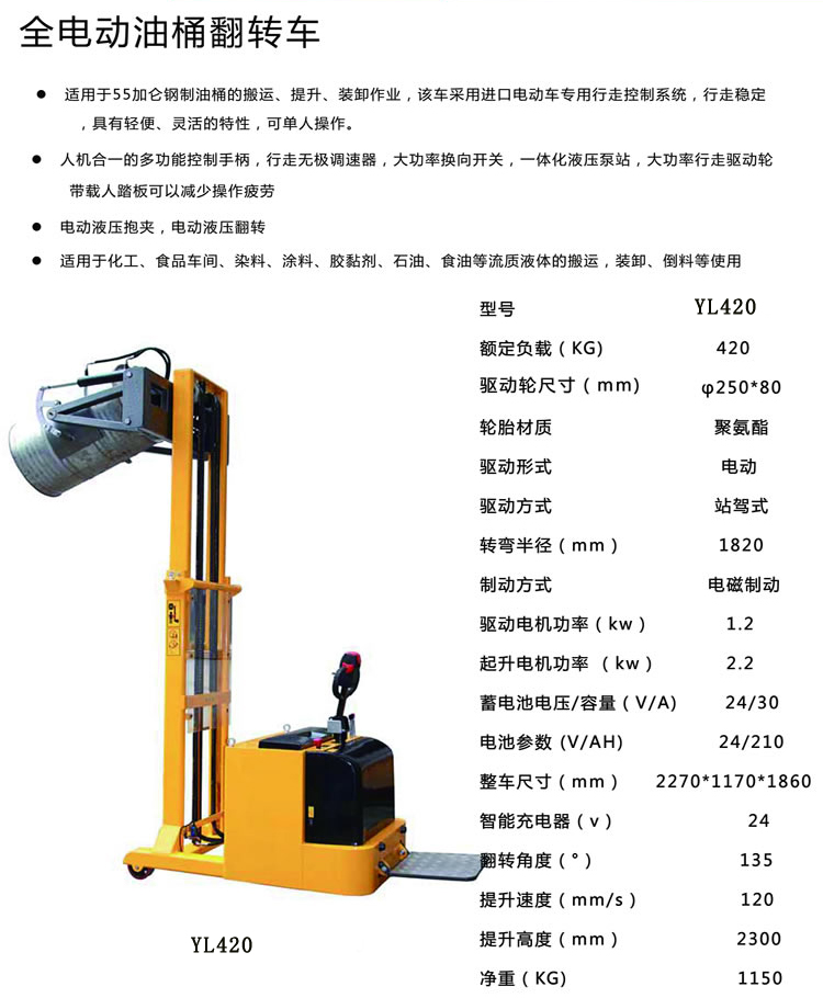 | YL420 | 420 | 250/80 | 聚氨酯 | 電動(dòng) | 站駕式 | 1820mm | 電磁制動(dòng) | 1.2kw | 2.2kw | 24/30 | 24/210 | 2270*1170*1860 | 135 | 120 | 2300 | 1150 |