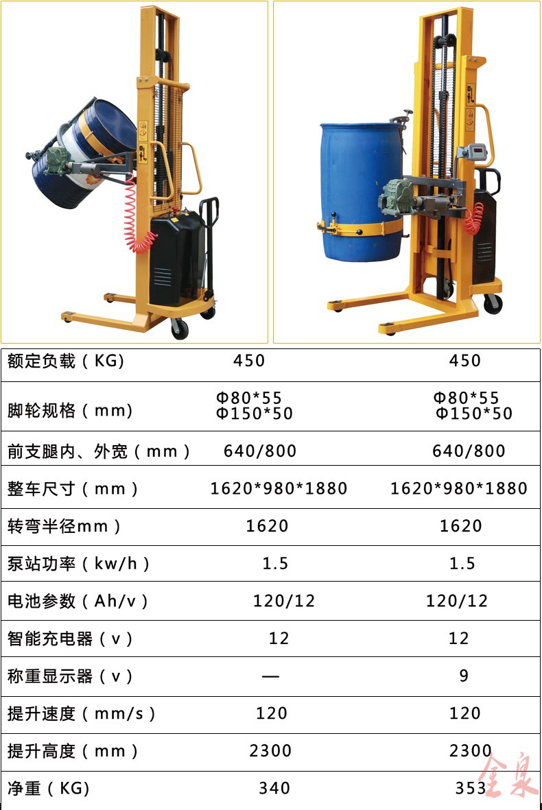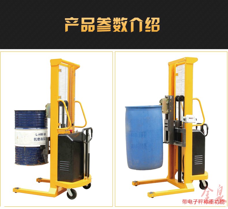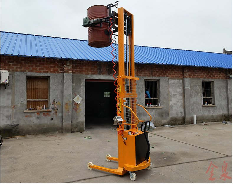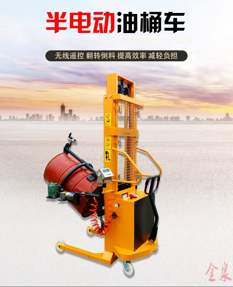 COTO翻轉(zhuǎn)式半電動油桶裝卸倒料車為手推行走、電動升高、翻轉(zhuǎn)方式可選為(手動式或電動式) 最大起升重量350Kg,起升高度1500-4500mm,前輪使用180MM直徑大輪,使手推行走更省力。該油桶車在空中可利用減速機作180-360度旋轉(zhuǎn),兼有手動堆高車和油桶搬運車雙項特點,桶夾臂上端為鷹嘴機構(gòu),可牢固夾持油桶上沿,中間為手臂形夾臂,底部有一個拖舉裝置。電動油桶搬運裝卸車適合食品、油制品等流質(zhì)的裝卸及倒料或攪拌,在搬運的同時可稱出產(chǎn)品的重量。可傾式半電動油桶裝卸車大大提高效率,無噪音無污染。油桶夾有上下夾頂式和左右環(huán)抱式,晚上充電白天使用8小時以上。廣泛應(yīng)用于涂料油墨、膠粘劑、染料、顔料、農(nóng)藥、造紙、皮革、石油化工、碳酸鈣等行業(yè)。