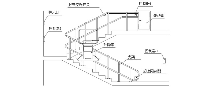 斜掛式輪椅升降機,一種安裝在樓道系統(tǒng)利用電機牽引沿著軌道上下移動并運載乘客的無障礙安全裝置。它由驅(qū)動系統(tǒng)、導(dǎo)軌、繩輪鏈、移動平臺等組成。用于建筑樓道系統(tǒng)中,乘坐輪椅或爬樓梯困難的人員攀爬樓梯的專用設(shè)備。主要由主驅(qū)動系統(tǒng),輔助驅(qū)動系統(tǒng)、主控系統(tǒng)和安全系統(tǒng)組成。