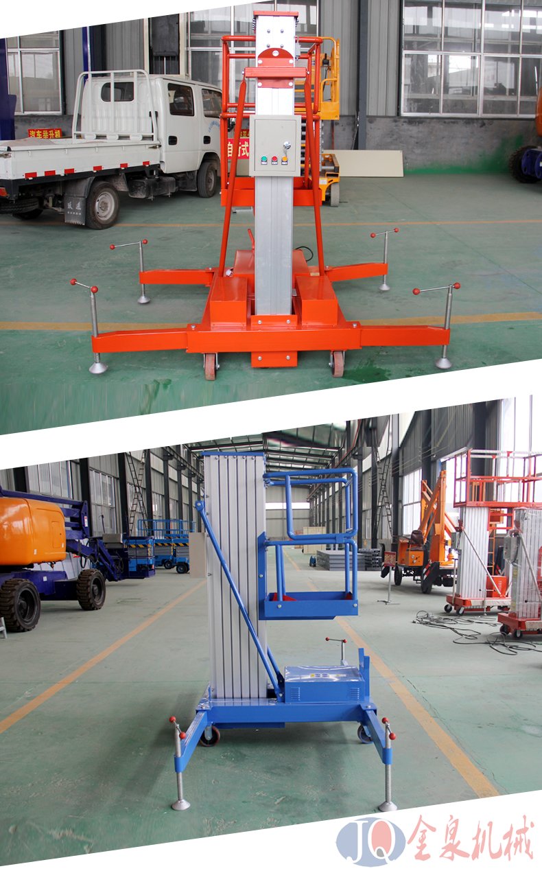 單柱鋁合金升降機:該系列產(chǎn)品為室內(nèi)型,廣泛適用于星級酒店,大型超市等各行業(yè)大廳、廠房內(nèi)的高空作業(yè), 具有升降平衡,操作方便,能進入一般門廳,可隨意進出電梯且耗電少、無污染、工作時不傷 地面,可用于貼墻工作及探出作業(yè),工作無死角。單立柱式鋁合金電動升降機配上龍門跨架附件,非常適合于影劇院、會堂、教堂等的維修工作。該龍門跨架組裝容易,操作省力,移動靈活,可跨越高度達1.1m的固定座椅等障礙物,并可在臺階上穩(wěn)定 作業(yè)。 高強度矩形鋼管制作, 剛性、穩(wěn)定性好。 配有萬向腳輪,機動靈活。 兩端架跨距可調(diào),能適 用于跨越不同障礙物的要求。 兩端架垂直可調(diào),可用于一定坡度的斜面或臺階上作業(yè)。
